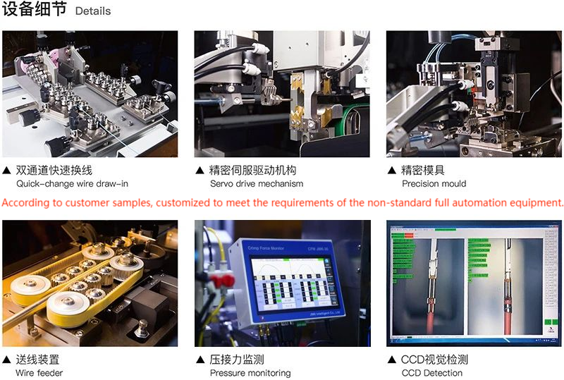 Functions: sleeving copper rings, stripping outer skin, flipping shielding wires, removing aluminum foil and stripping inner insulation, crimping center pins, threading outer conductors, flipping back shielding and fixing copper rings, crimping shielding copper rings, NG analysis and treatment (can be customized according to needs).