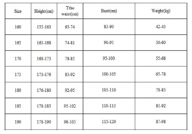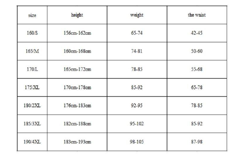 Size: 160/S, 165/M, 170/L, 175/XL, 180/2XL, 185/3XL, 190/4XL