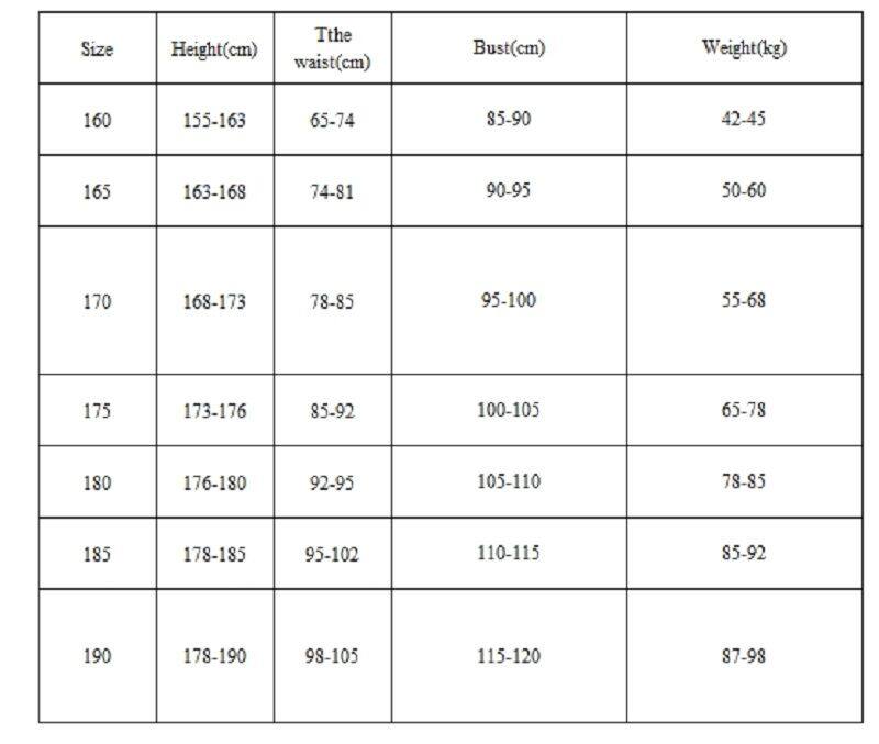 Size: 160/S, 165/M, 170/L, 175/XL, 180/XXL, 185/XXXL, 190/XXXL