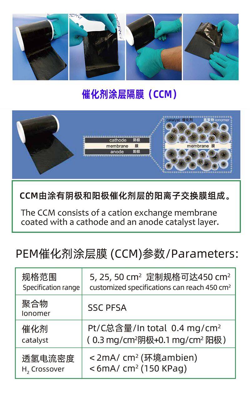 PEM catalyst coated membrane (CCM) is composed of cathode and anode catalyst layers coated on both sides of proton exchange membrane (PEM). As the core material of proton exchange membrane electrolyzer and hydrogen fuel cell, the performance of PEM catalyst coated membrane (CCM) determines the efficiency and service life of the whole equipment.
