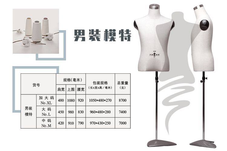 There are three series of dyapiag mannequins in our company, which are Female with S, M, L, XL, four sizes in total, grey in colour), Male with M, L, XL three size in total, grey in colour, and the Realia Mannequin which is half size of the female M size, grey is colour, that is very suitable for the fashion teaching classes. And each set of the mannequin is equipped with a metal base, and a set of supporting tools.