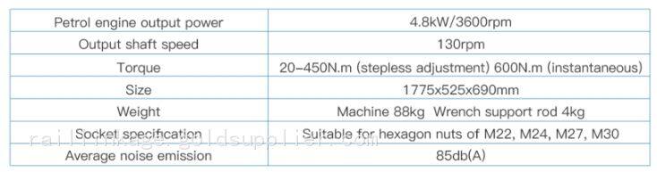 NLB-600 universal power wrench can quicklyand easily tightens and loosens all wrenchedjoints along the track. Accurately controlledand stable. This machine uses gasoline engineas power, the output shaft is single-head,single-speed, forward and reverse adjustable,output torque can be manually adjusted andaccurately displayed, the whole machine iseasy to operate, safe and reliable, and conve-nient to go up and down, and can be equippedwith lighting lamps for supply Lighting at thesleeve head during night work.