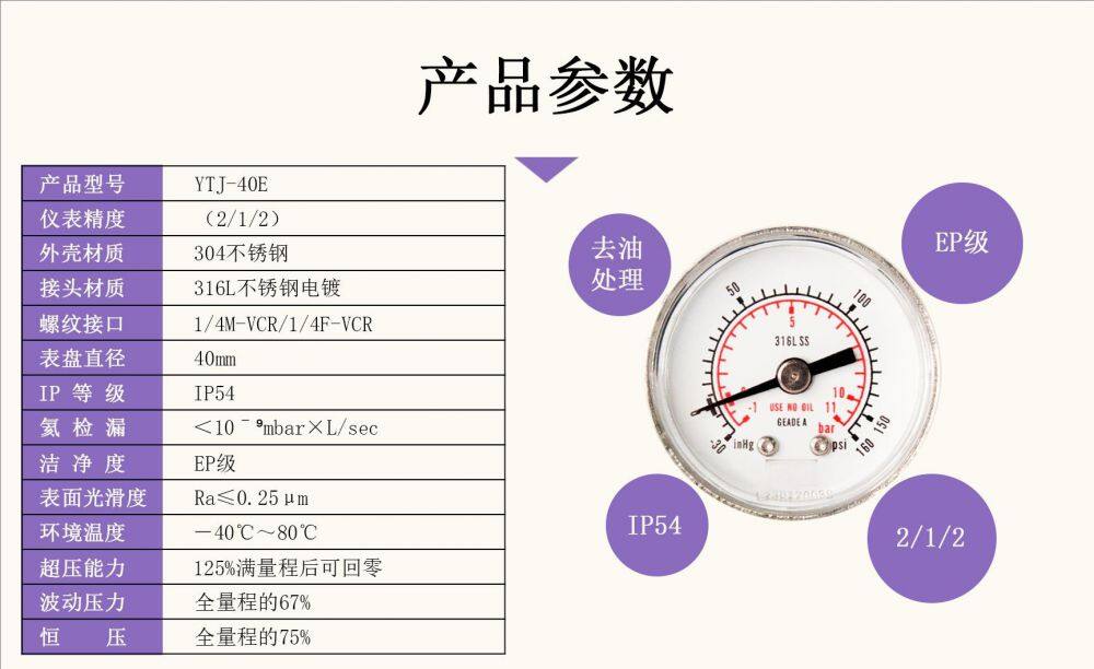 EP class 0~100PSI,EP class 0~3000PSI,EP class -30~160PSI,VCR male and female thread clean pressure gauge