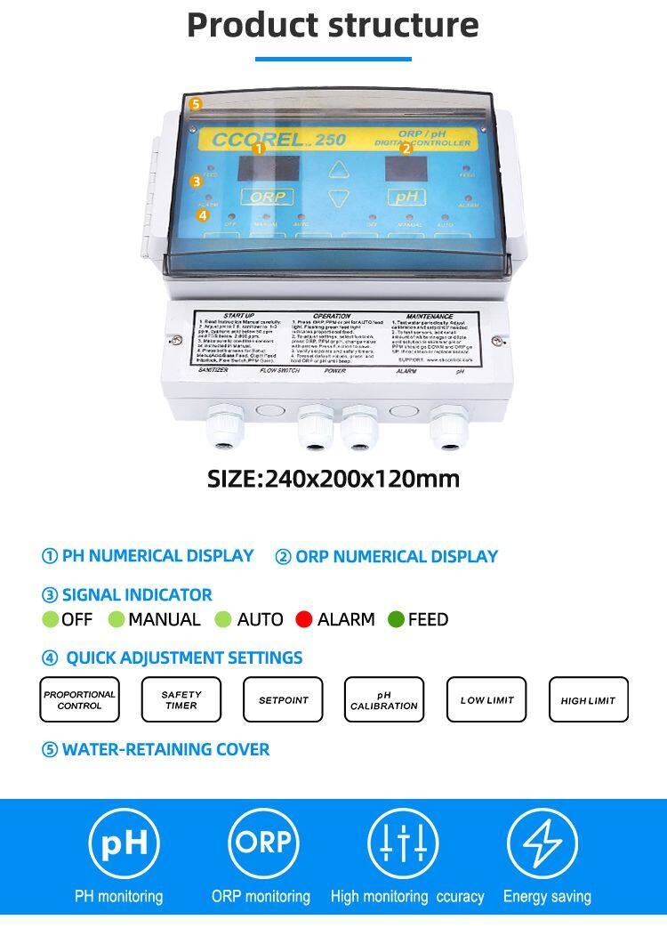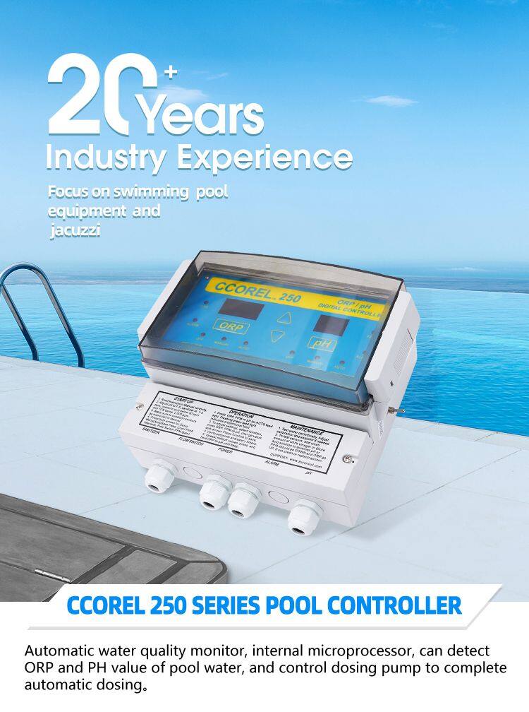 The CCOREL 250 ORP/PH Digital Controller automatically maintains both sanitizer ORP and Water PH in pools and spas. All operating functions are clearly labeled and accessible from the front panel with safety and easy-rest features not found on other controller. The PH control level is 7.0.