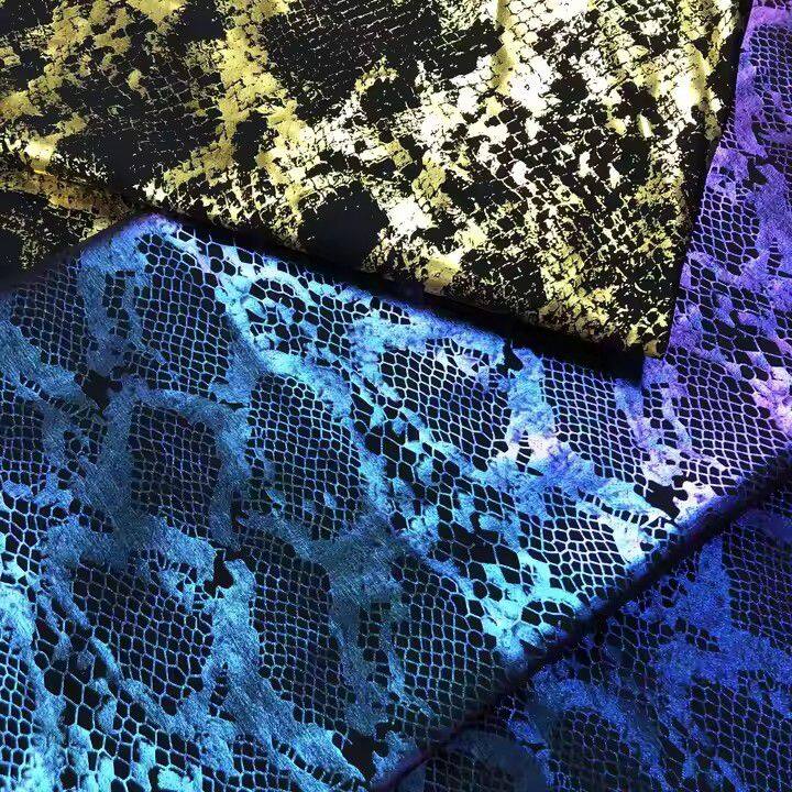 Shiny Holographic Reflective Snake Pattern Shiny Foil Print Nylon Spandex Knitted Fabric for Swimwear Sportswear