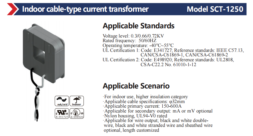 UL2808 Bct-1250 Solid Core Current Sensor 100A/40mA 0.2 Accuracy Class