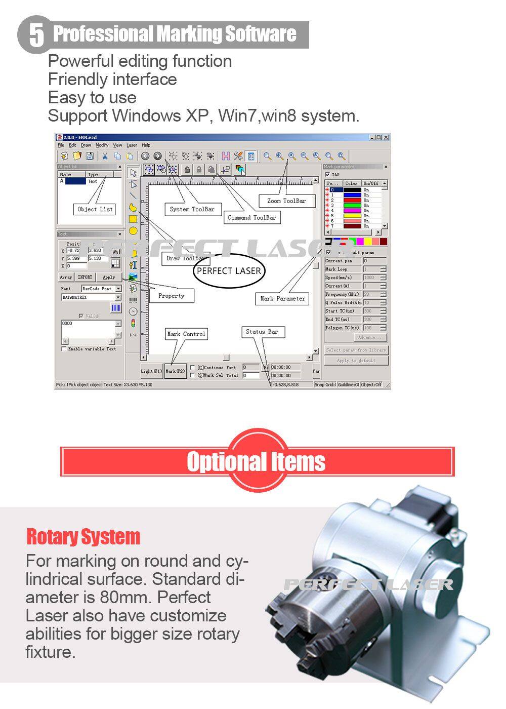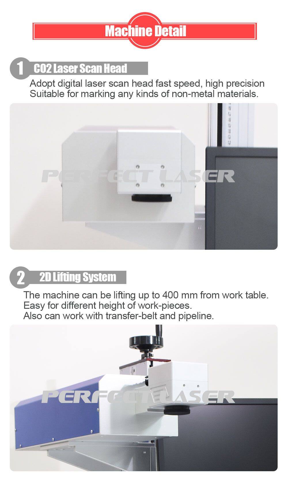 This flying co2 laser marking machine is widely used in embroidery, trademark, buttons, glasses, clothing, sanitary ware, glassproducts, advertising materials, food and beverage packaging, pharmaceutical packaging, electronic components, handicraft processing, stone, paper packaging, plastic products, paper labels, plastic resin, bamboo wood crafts, PCB board etc. The graphics and text, for the vast majority of non-metallic materials and a metal material marking.