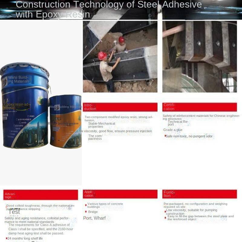 Epoxy resin steel-bonding adhesive is a professional structural adhesive used for steel-bonding reinforcement, occupying a leading position in building structural adhesives. It is composed of modified epoxy resin, curing agent, toughening agent and filler, presenting as a paste, two-component, safe, environmentally friendly and with stable performance.