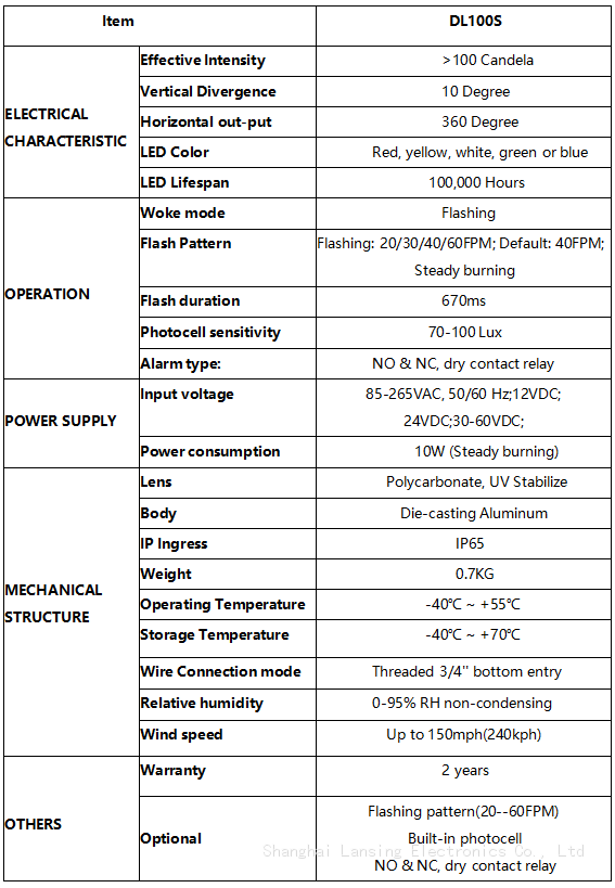 Our DL100S low intensity obstruction light is compliant with industry regulations and standard, ensuring that it meets the necessary requirements for aviation safety. It emits a steady or flashing red light that is easily recognizable by pilots, providing a clear indication of obstacles in their flight path.