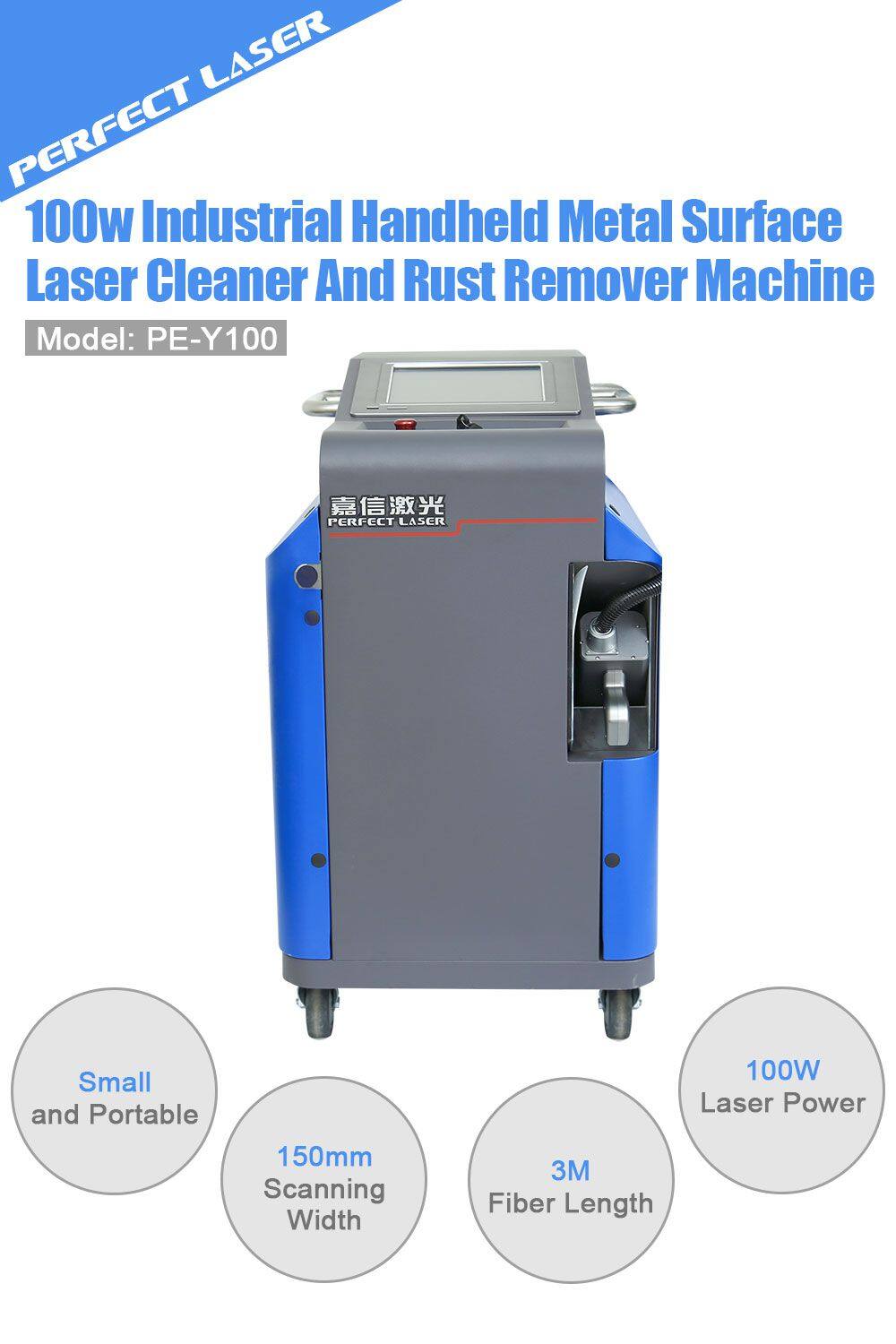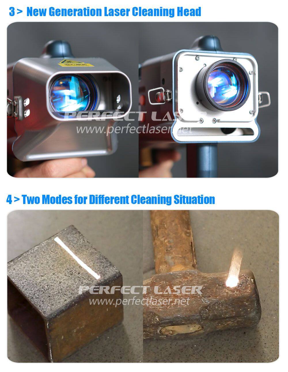 Perfect Laser new type industrial laser cleaning machine is using laser surface decontamination capability and optical fiber transmission guide technology, so that the laser metal cleaning machine is highly efficient and eco-friendly. Compared with chemical cleaning, laser cleaning does not need any chemical agents and cleaning fluids. Compared with mechanical cleaning, the fiber laser metal derusting machine has no wear and tear, no consumables,and less damage to the substrate. Wide range of applications (even nuclear pipeline cleaning). The technology of the 100w fiber laser metal cleaning machine has been applied internationally in all fields (mold cleaning, fighter coating cleaning).