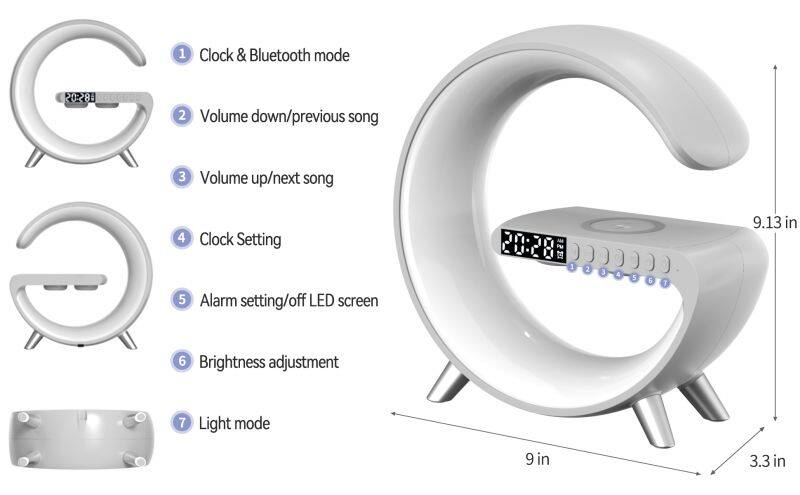 New Arrival Trending Products G Shaped Wireless Charger Led Lamp With BT Speaker Alarm Clock USB Interface Table Lamp