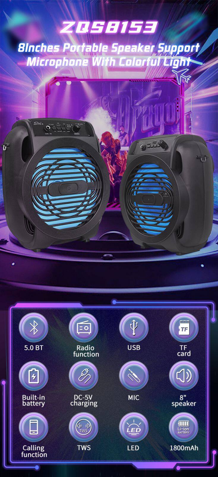 ZQS8135 Factory Custom 15W Power Single 8 Inch Speaker Wireless Bluetooth Speaker With Colorful Light