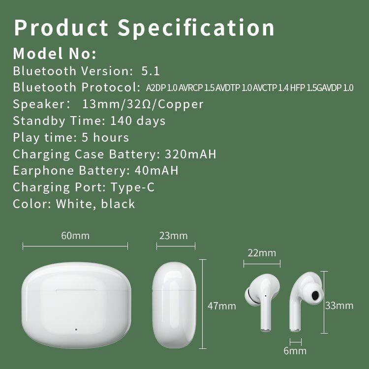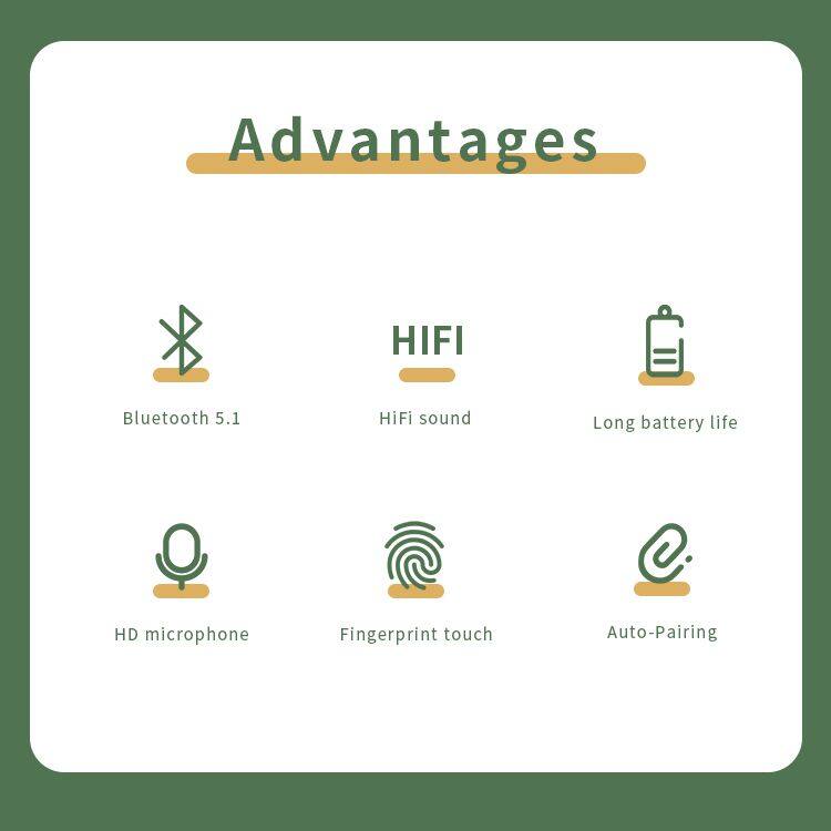 Features | 15 meters. Signal Distance Comfortable Ergonomics Upgrade the touch operation 6D noise reduction sound quality Emergency charging Open-cover connection Ultra think and portable Full frequency moving iron unit Full Bluetooth 5.0 lossless transmission Independent Acoustic Cavity Instructor Level Motor Tuning 9th generation noise reduction |