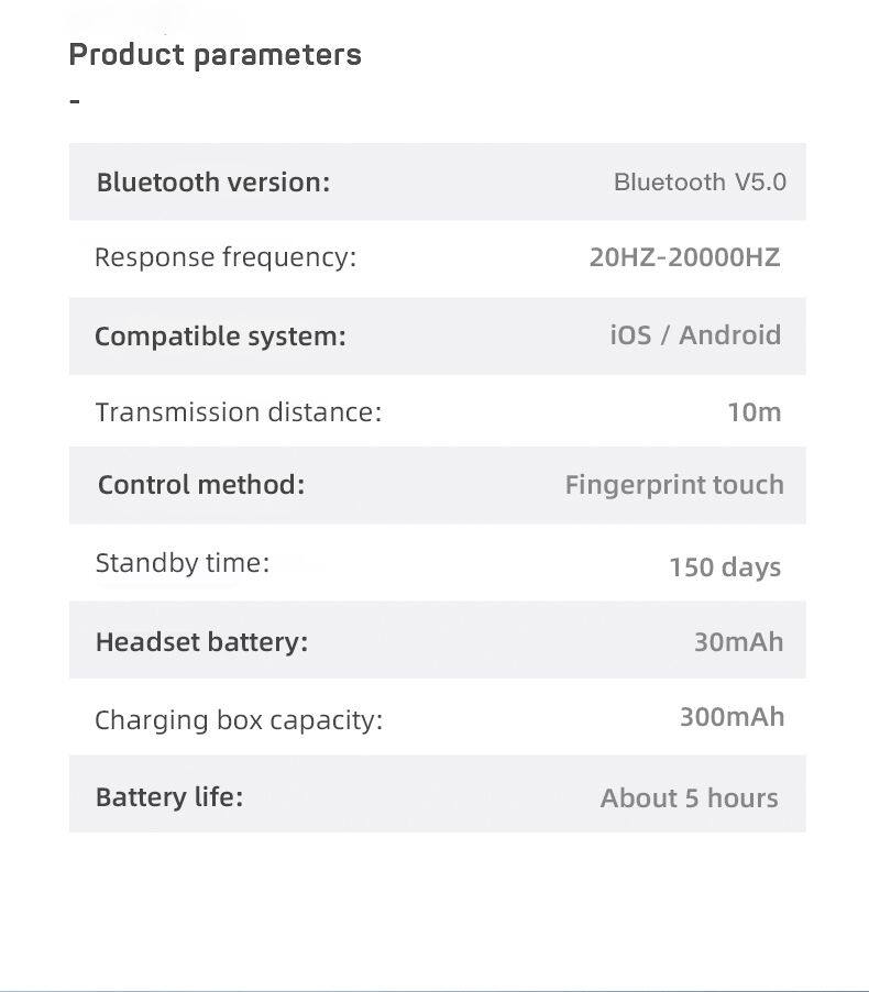 Battery capacity | 28mAh for earphone; 280mAh for charging box | ||||||