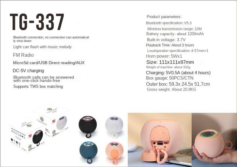 Description Report Item TG337 Speaker specifications: Wireless:V5.3 Working distance:10M SNR:≥90db Battery:3.7V about 1200mAh Normal volume playing time:about 3 hours with LED light off Power:4Ω/5w*1 Frequency response:120Hz-20KHz Unit size:111*111*87mm Unit weight:about 332g(not include accessories) Charging:5V/1000mA Charging time:about 4h NOTE: 1.International advanced wireless chip and circuit design techniques,support wireless devices. 2.With FM function,can search radio station broadcast automatically, 3.With Hi-Fi speaker,to make sure the clear and bright sound. 4.Support Micro SD card and USB card,play MP3 format audio. 5.The wireless working distance is 10 meters. 6.With AUX line in,can directly connect the outside devices,for example,tablet PC/TV/cell phones. 7.It will close automatically after 30 mins. 8.A variety of flashing LED lights with different colors,color lights flash follow the melody. 9.Support TWS. |
