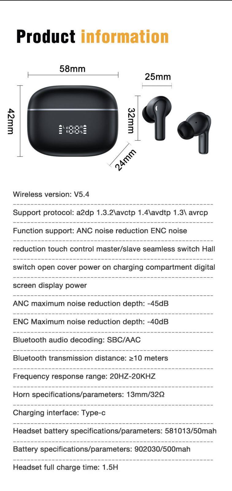 Hybric Gaming ANC ENC Headphones Wireless Earbuds 5.3 TWS LED Display Active Noise Cancelling Earbuds