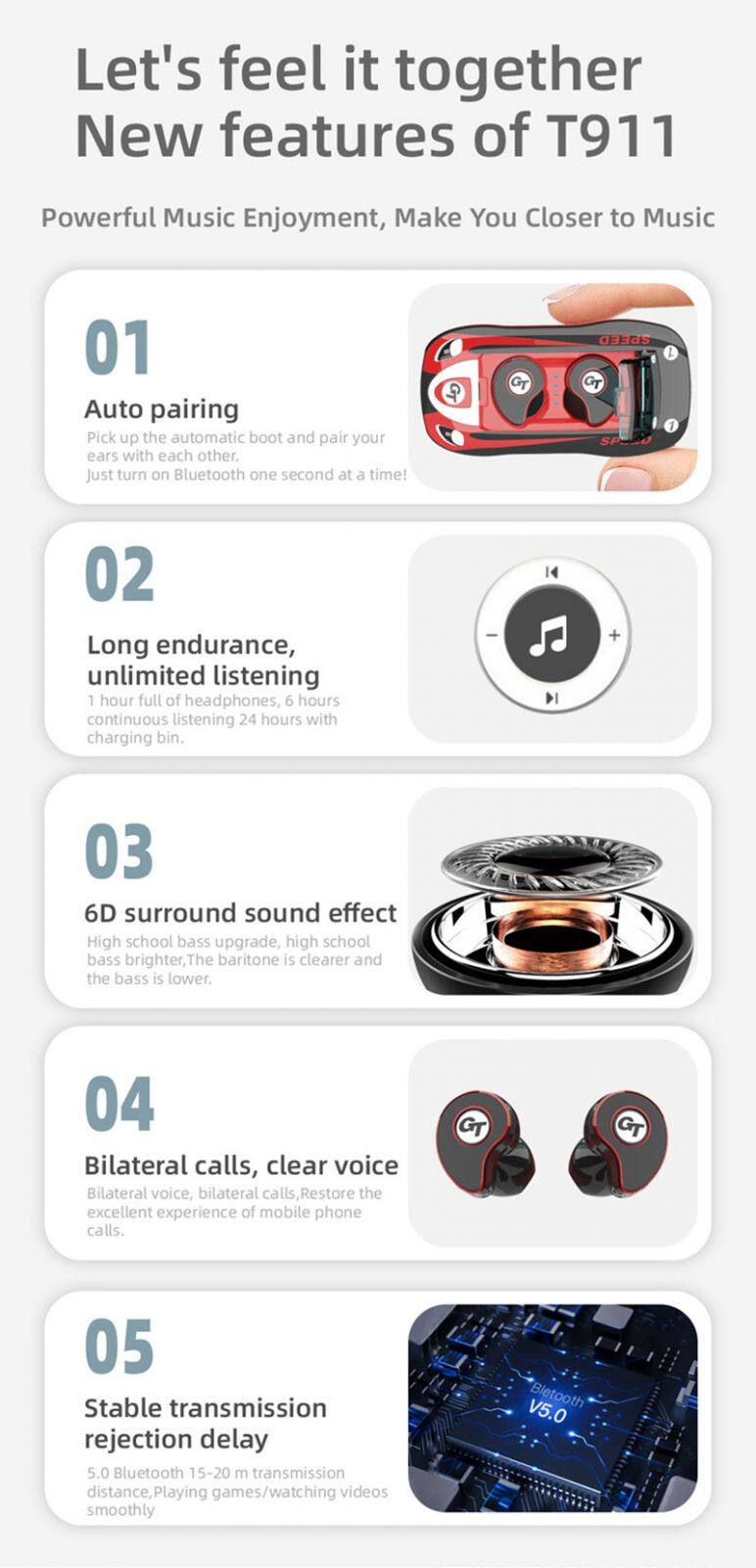 T911 TWS BT Earphone Wireless Headphones IPX5 Waterproof Sport 6D Stereo Noise Cancelling Headset Earbuds for Smart Phone