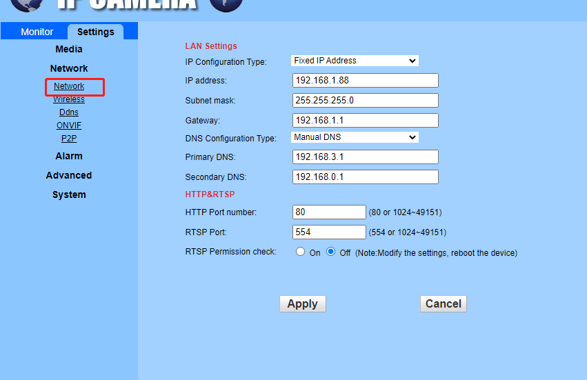 Check the IP address on the camera label, the default is 192.168.1.88 (the actual value on the camera label shall prevail).