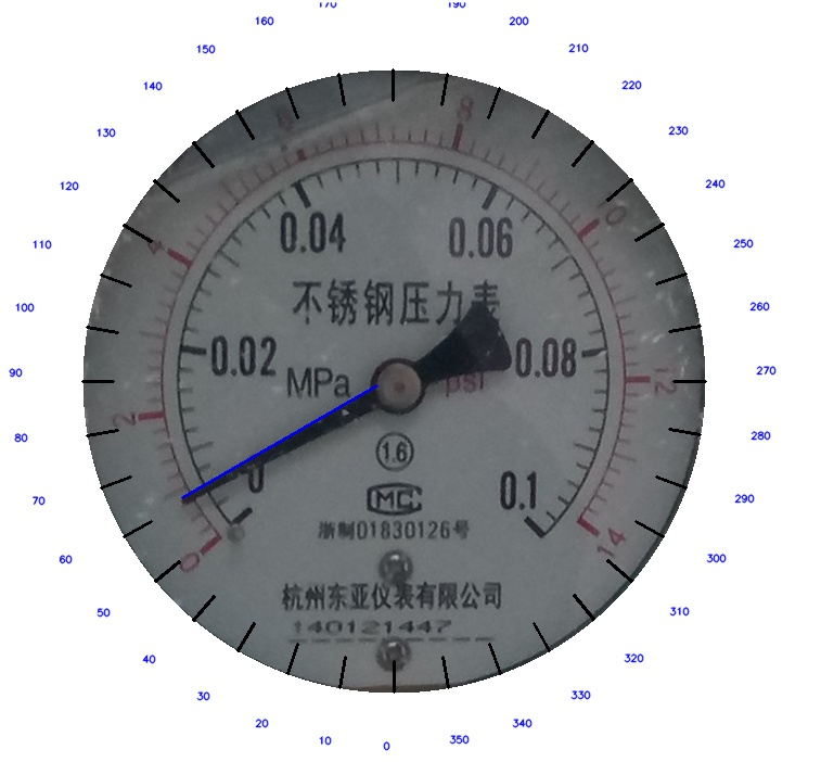 The identification process is: using some special methods to complete the effective area screening and the pointer positioning of the instrument, according to the dial center to the dial center of the line and the Angle of the sub-dial 0 scale line, calculate the Angle between the sub-dial 0 scale line and the pointer pointing line segment, and further identify and interpret the pointer reading. The experimental results show that the algorithm is simple and accurate, and overcomes the influence of the dial's random Angle tilt on the reading recognition algorithm.