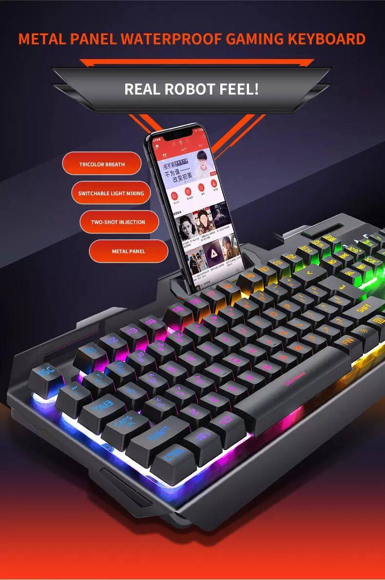 Metal Panel V2 Waterproof Gaming Keyboard Rainbow Backlight Portable Keyboard With Exclusive Mobile Phone Holder