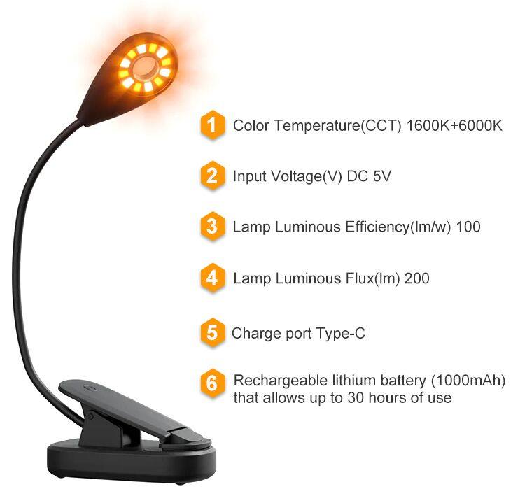 1600K Rechargeable Extra Bright Gooseneck Clip On Book Reading Light With 3 Brightness Settings