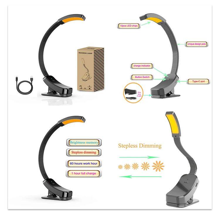 1600K Rechargeable Extra Bright Gooseneck Clip On Book Reading Light With 3 Brightness Settings