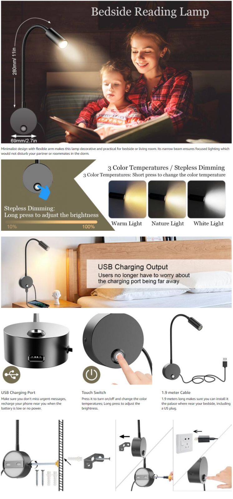 - New USB Rechargeable 360 Degree Rotate Magnetic Wall Lamp Touch Control LED Mounted Reading Wall Light For Bedroom