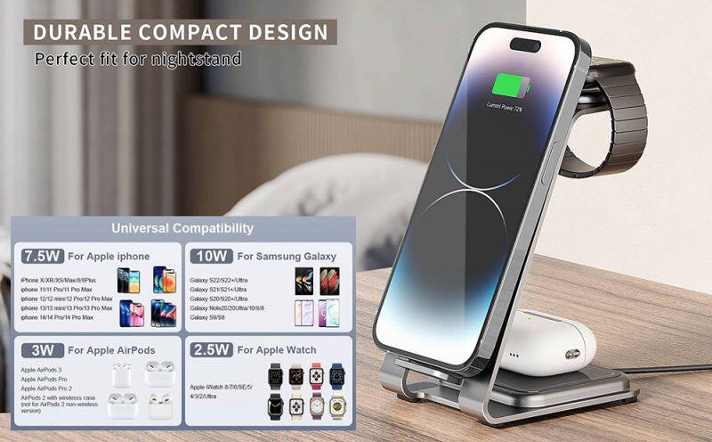 Feature | 1:15W Fast wireless charger,Compatible with 10w. 7.5w,5w. 2: 3W wireless charging For AirPods 3: 2.5W wireless charger for iWatch |