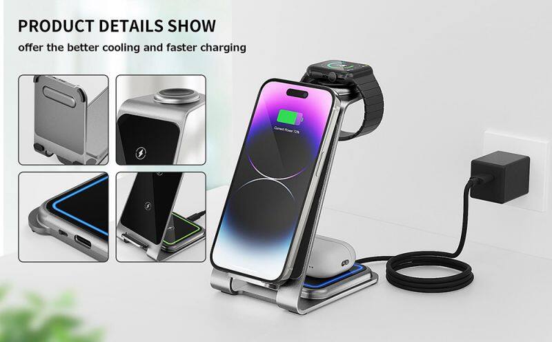 Aluminium Shell Stand Holder Fast Charging 3 in 1 Wireless Universal Charger for Phone Headset and SmartWatch