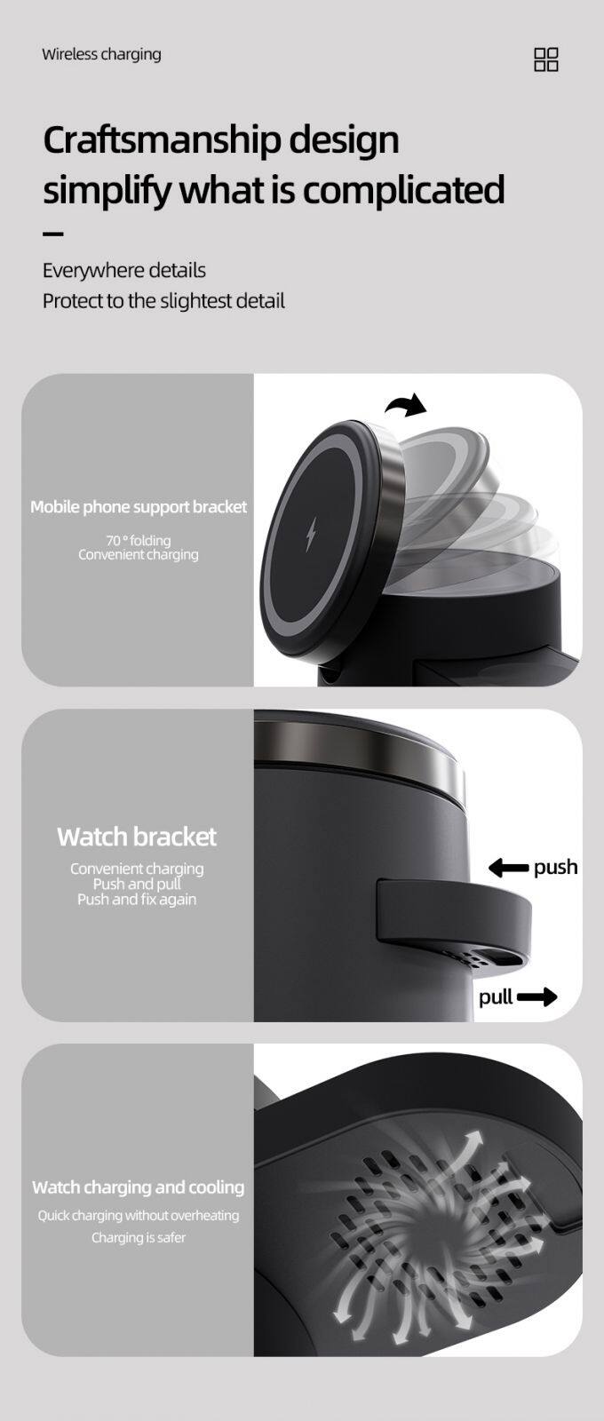 Feature | 1:15W Fast wireless charger,Compatible with 10w. 7.5w,5w. 2: 3W wireless charging For AirPods 3: 2.5W wireless charger for iWatch and Galaxy Watch | ||||||