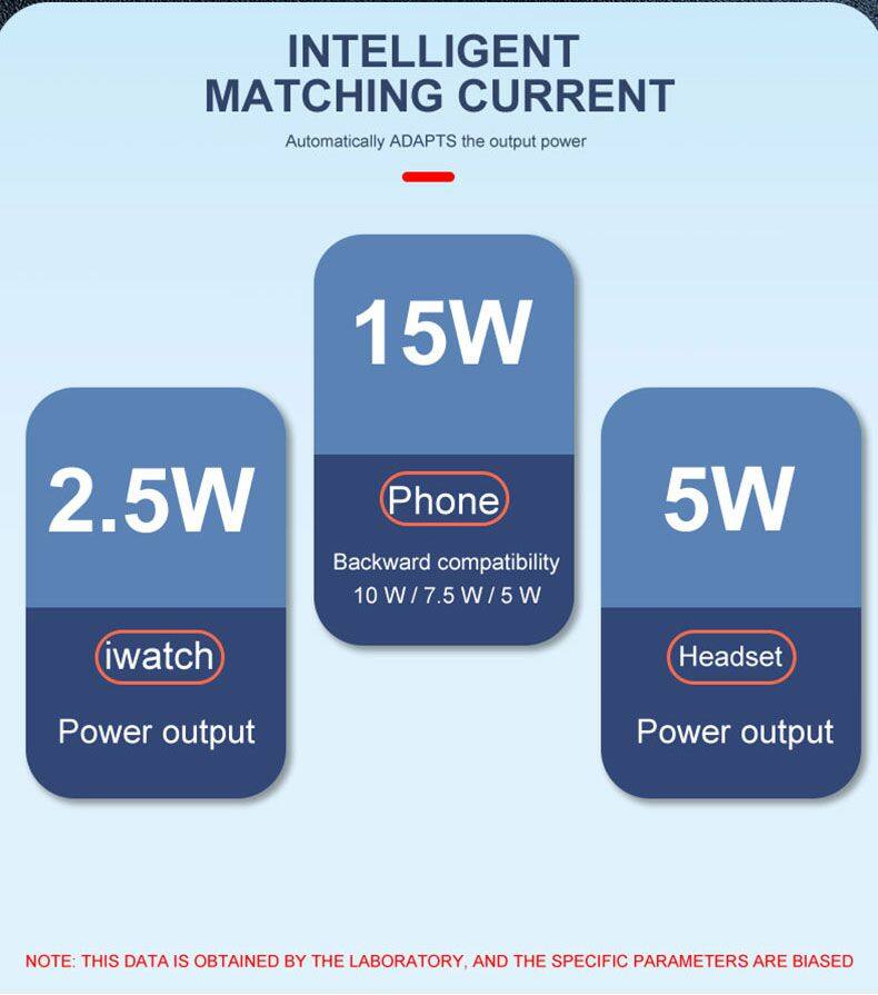 Feature | 1:15W Fast wireless charger,Compatible with 10w. 7.5w,5w. 2: 3W wireless charging For AirPods 3: 2.5W wireless charger for iWatch4: Foldable Wireless Charger 5: With Atmosphere Lamp | ||||||