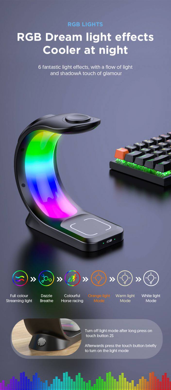 Lighting mode | Full Color streamer loght->Dazzle breathe->Colorful racing mod->Orange light mode->Warm light mode->White light mode | ||||||