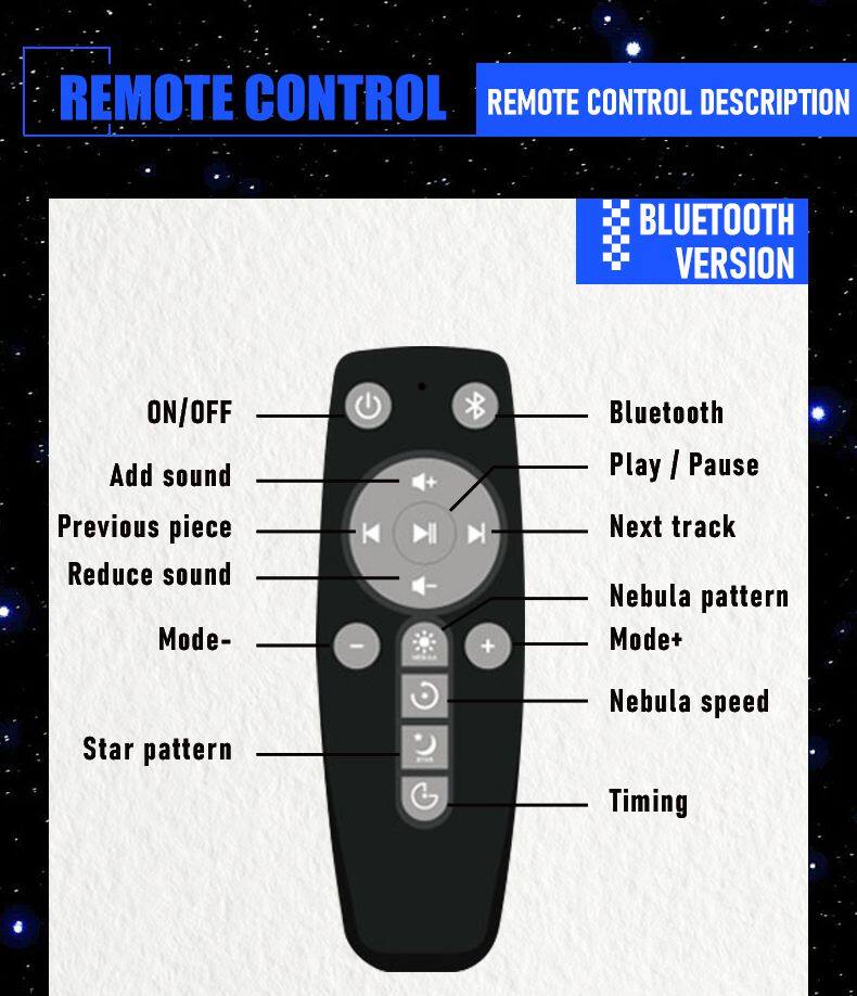Function | BT Speaker, Rotating Head, Remote Control, Nebula & Star Projection |