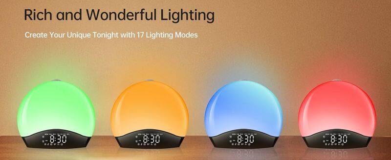 - RGB Sunrise Alarm Clock Wake Up Light With Sunrise Colorful Bedside Lamp Sunset Night Light FM Radio Clock Natural Lights
