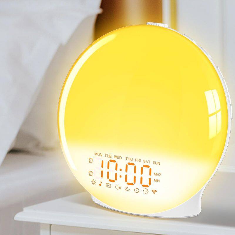 - NEW Arrival Sunrise Alarm Clock Wake Up Light With Sunrise Colourful Bedside Lamp Sunset Night Light FM Radio Clock