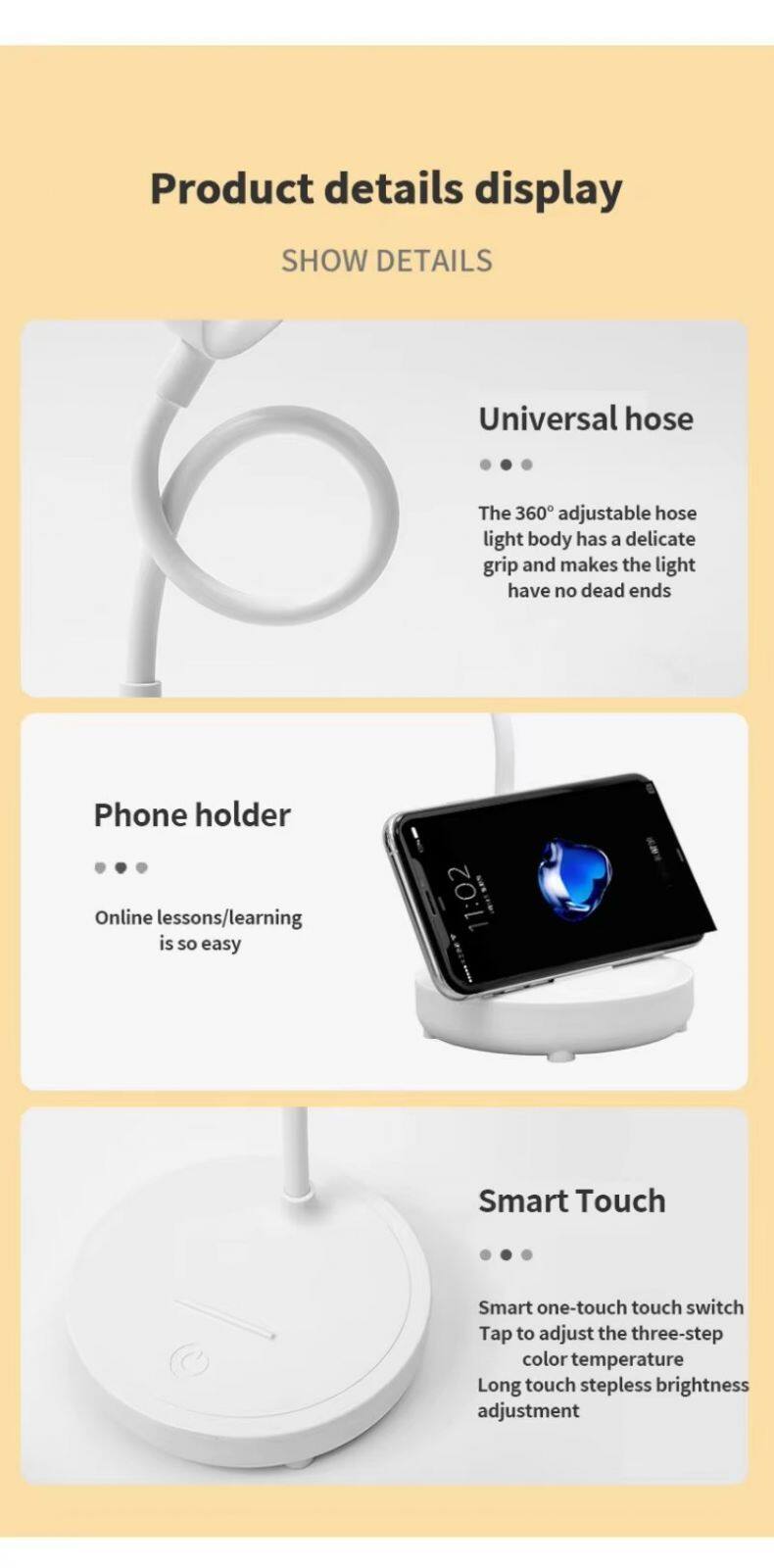 Details | lnput voltage: 5V1A lnterface: Micro USB Color: white Lighting color: Natural light (4500K), Warm light (3000K), White light (6500K) Net weight: 300g Gross weight: 350g Rechargeable battery:1200(mAh) |