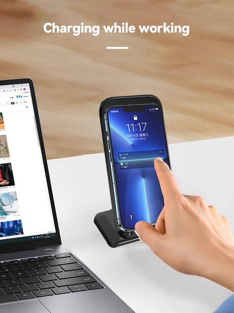 Wireless charger stand on desktop, some clients open face meeting when vertical charging or open data form when horizontal charging. 2 wireless charging coil design wireless charger take more better experience.
