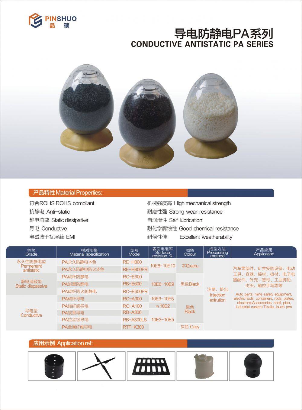Main features: Conductive anti-static PA is made of PA6 or PA66 raw materials, adding carbon fiber, carbon black metal fiber, metal powder, antistatic masterbatch, etc., which can achieve antistatic, static dissipation, conductive and electromagnetic wave interference EMI shielding and other functions. Conductive anti-static PA has strong mechanical properties, good toughness, good dimensional stability, excellent self-lubrication, wear resistance, heat resistance, cold resistance, weather resistance, chemical resistance and other properties.