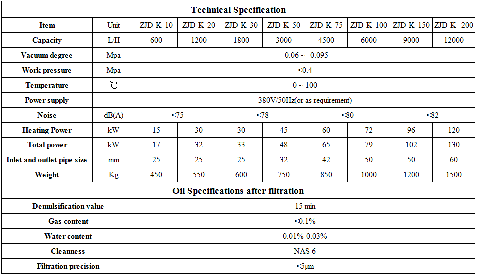 1. ZJD-K is composed of ZJD vacuum hydraulic oil purifier and BK press filter machine,the two functions can be worked together or worked separately.