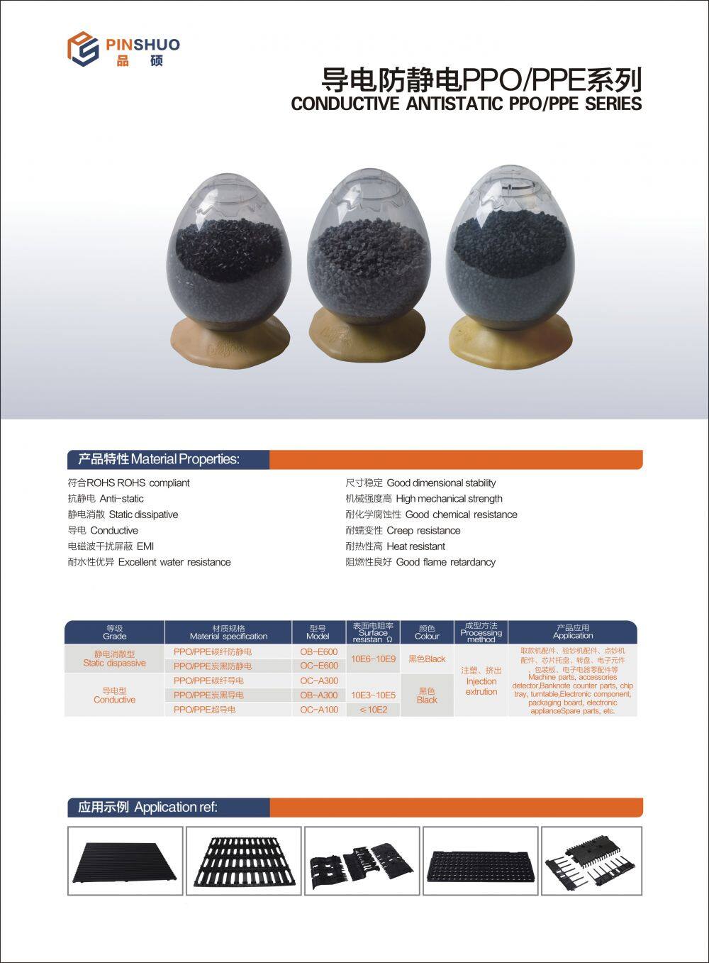 Conductive anti-static PPO is based on PPO raw materials, adding carbon fiber, carbon black, metal fiber, metal powder, antistatic masterbatch, etc. to achieve antistatic, static dissipation, conductivity and electromagnetic interference (EMI) functions. Conductive anti-static PPO has high mechanical strength, dimensional stability, low shrinkage, creep resistance, heat resistance, water resistance, acid and alkali resistance, and washing resistance.