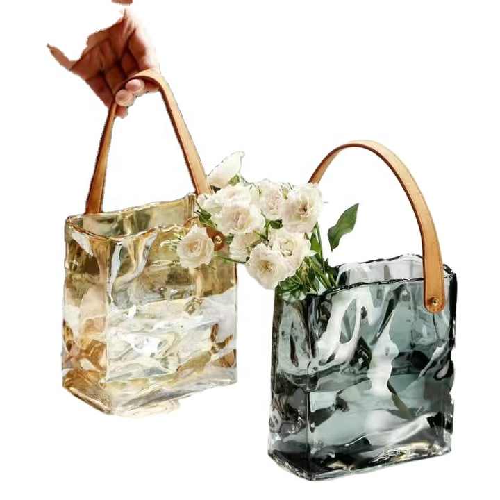 Square Leather Tote Bag Glass Vase Glass Bag Vase Rectangular Glass Terrarium Vase With Belt Handle