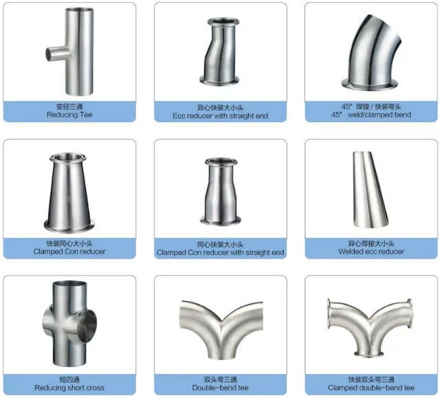Including S-Line tri-clover pipe fittings, I-line pipe fittings, butt welded pipe fittings, beveal seat fittings, Q-line pipe fittings.