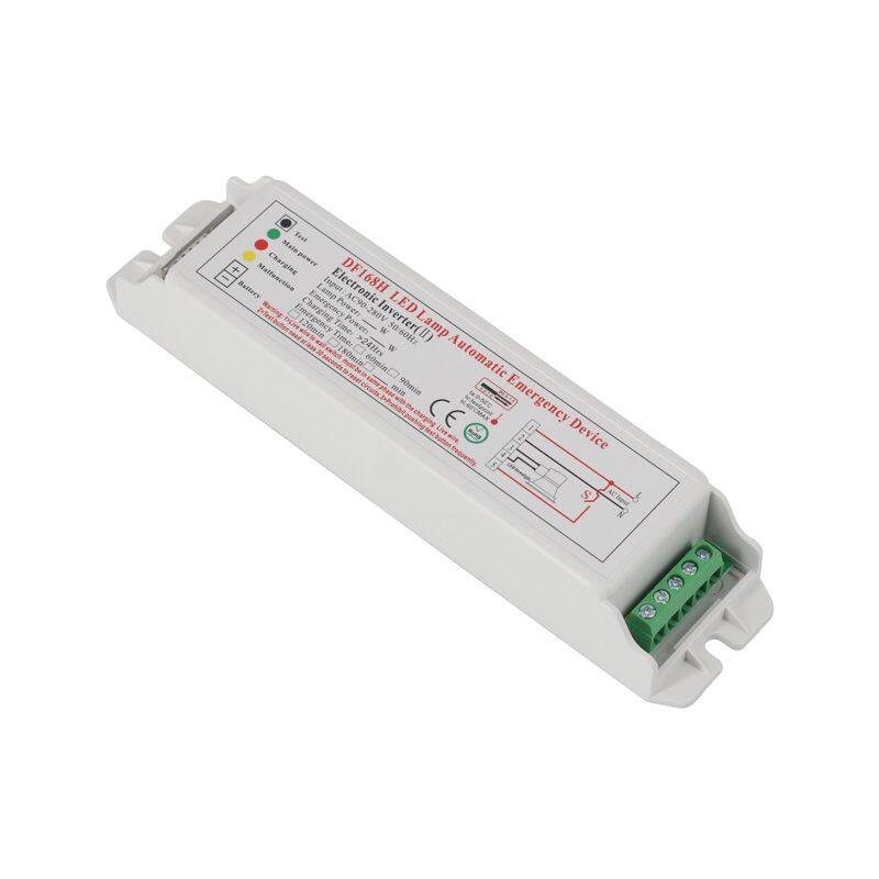 DF168H model LED Emergency power supply, Suitable for 25W LED tubes,led panel lights, three-guard lights, line lights, flat lights, spotlights, ceiling lights, etc., power outage emergency output power equal to the mains lighting power, emergency time can be customized, with 11.1V terre lithium battery pack or 12.8V lithium iron phosphate battery pack use, can also use 12V nickel-chromium battery pack or nickel-metal hydride battery pack