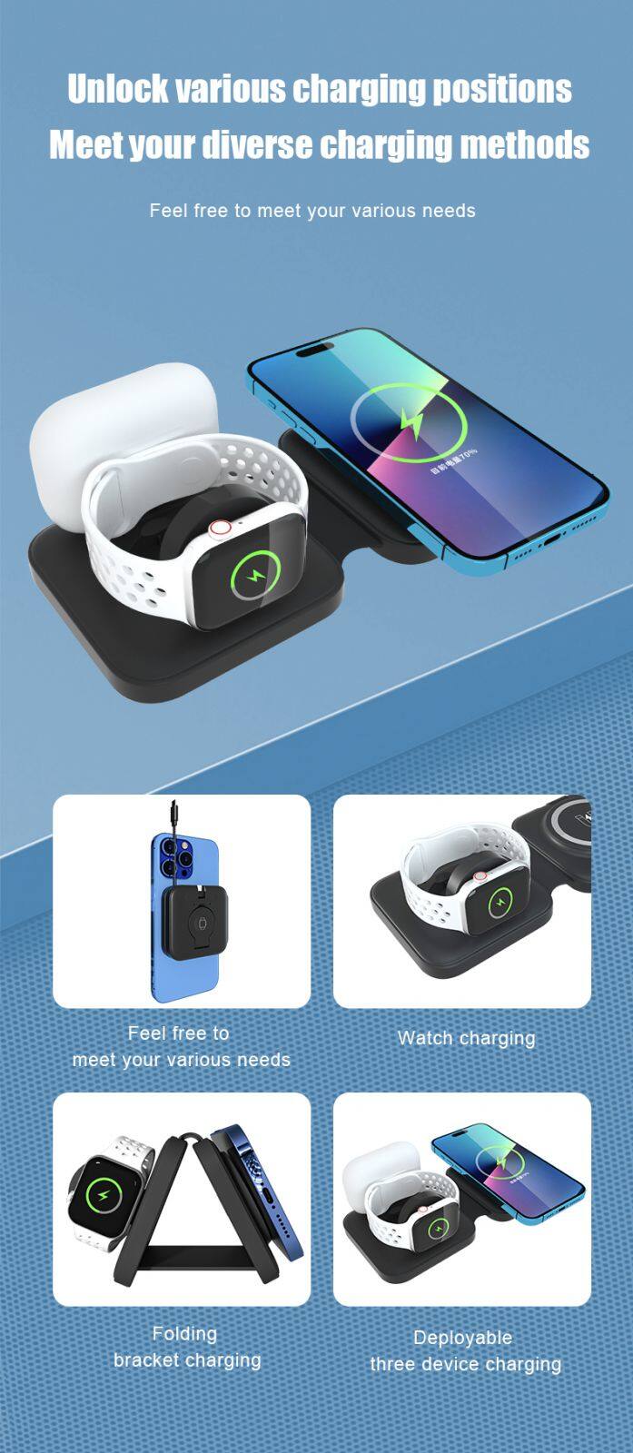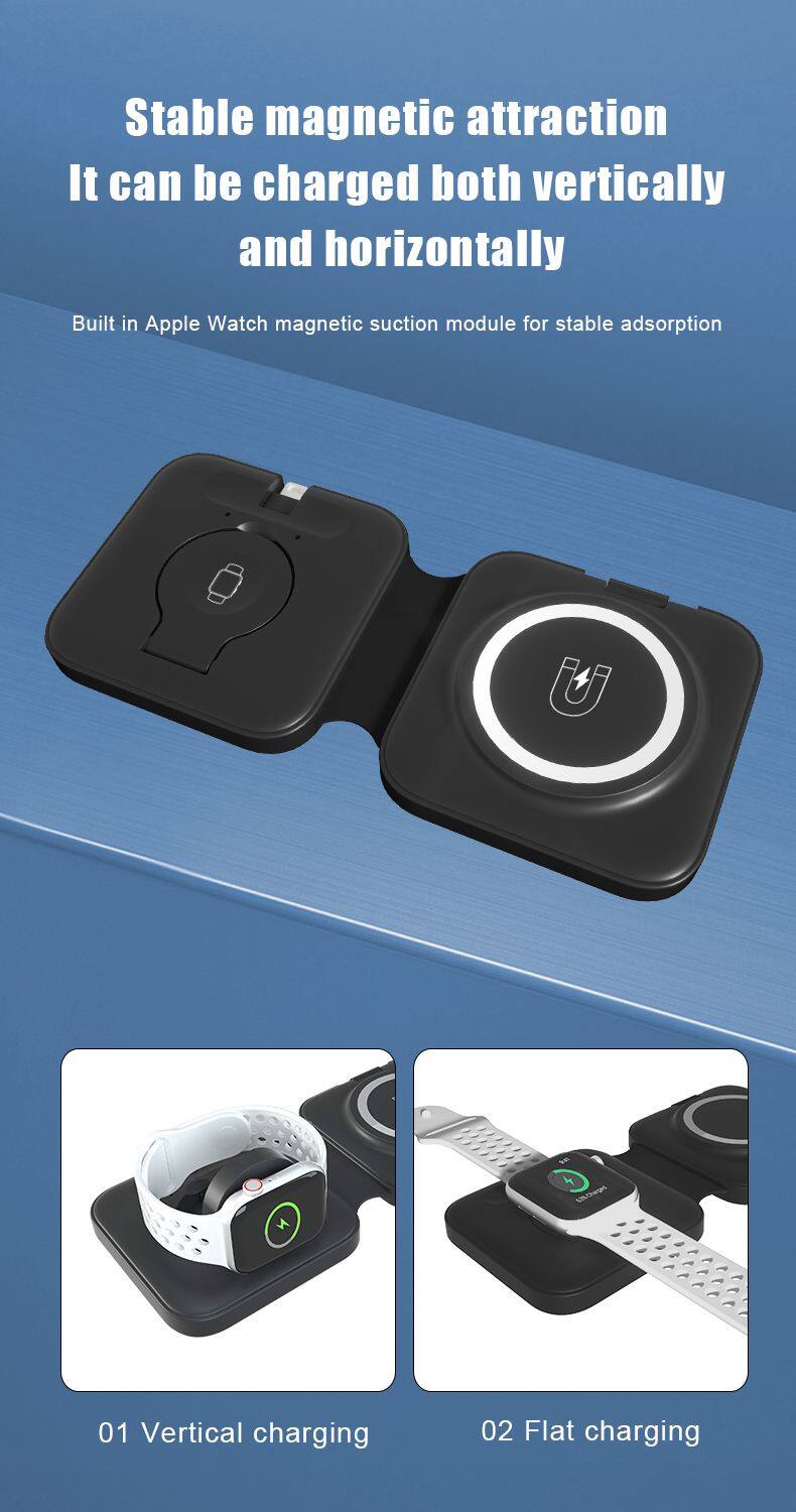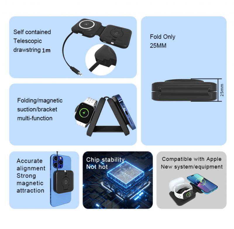 Type | Magsafe Compatible Foldable Wireless Charger 15W 3 in 1 with 1m Retractable Cable for iPhone iWatch iPod |