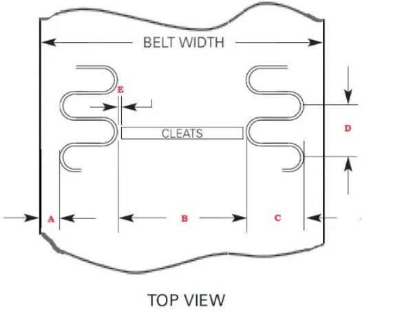 - "E" - Cleat gap (optional: for applications that have cleats present on the belt): the distance between the cleat and the sidewall, measured from inside of the sidewall to the edge of the cleat.