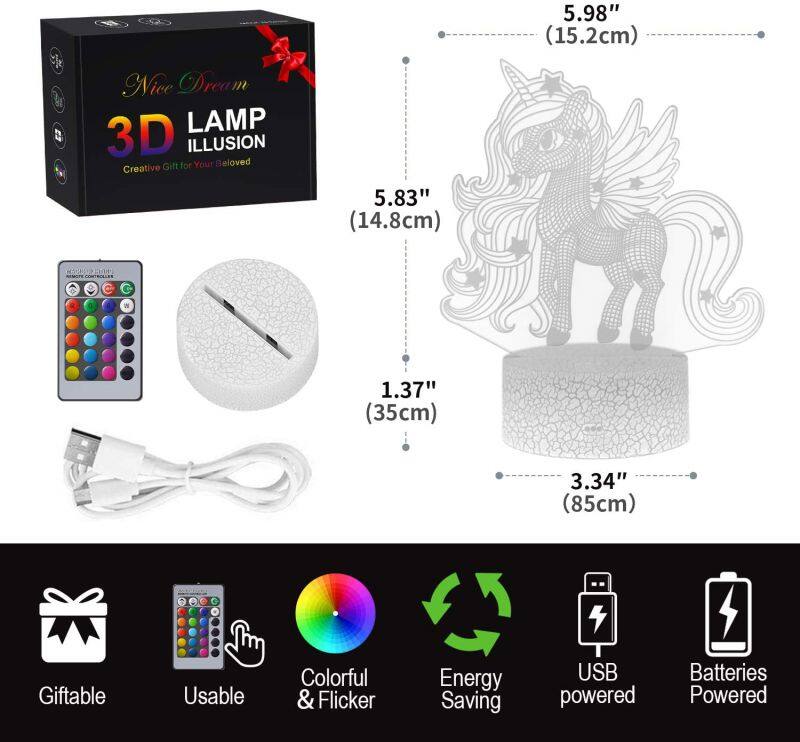 Home > Products > Other > Unicorn 3D Illusion Lamp Night Lights 16 Colors Changing With Remote Birthday and Holiday Gift for Children Girls Light