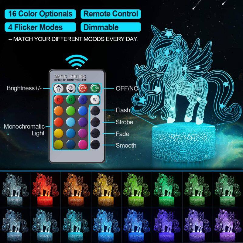 Unicorn 3D Illusion Lamp Night Lights 16 Colors Changing With Remote Birthday and Holiday Gift for Children Girls Light
