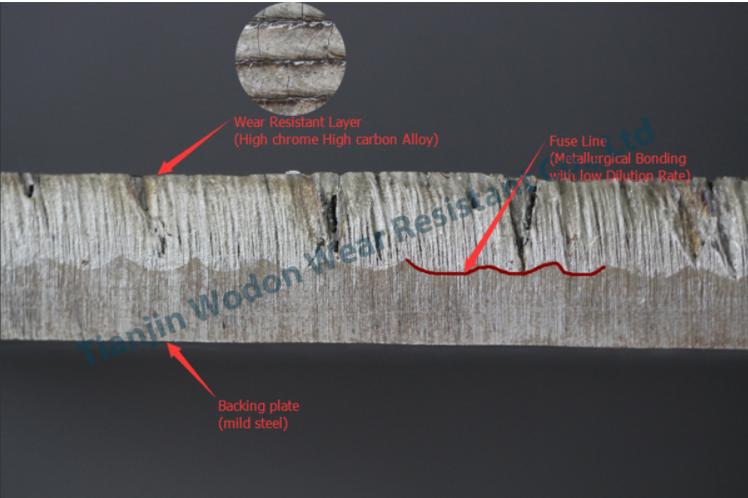 A:The chromium content as high as 25~50% in the overlay The chromium carbide (Cr7C3) volume fraction above 50% Uniform distribution and high hardness HRC 58~65 Smooth surface, thickness tolerance +0~+0.5 mm only Flatness tolerance -3~+3 mm/m