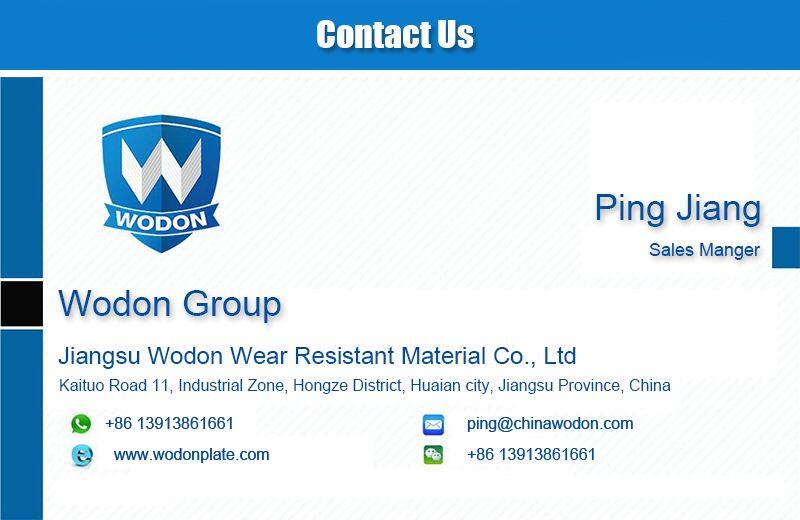 Jiangsu Wodon Wear Resistant Material Co., Ltd, founded in 2014, is a professional manufacture speacialising in reserching and developing wear resistant materials. Our main products are wear resistant plates, machined parts and flux cored welding wires, which are widely used in coal mining, cement, power plant, steel mills, machinery and other consumable areas. Our wear plates can greatly prolong the maintennace time, thus reducing maintenance cost in practical application.