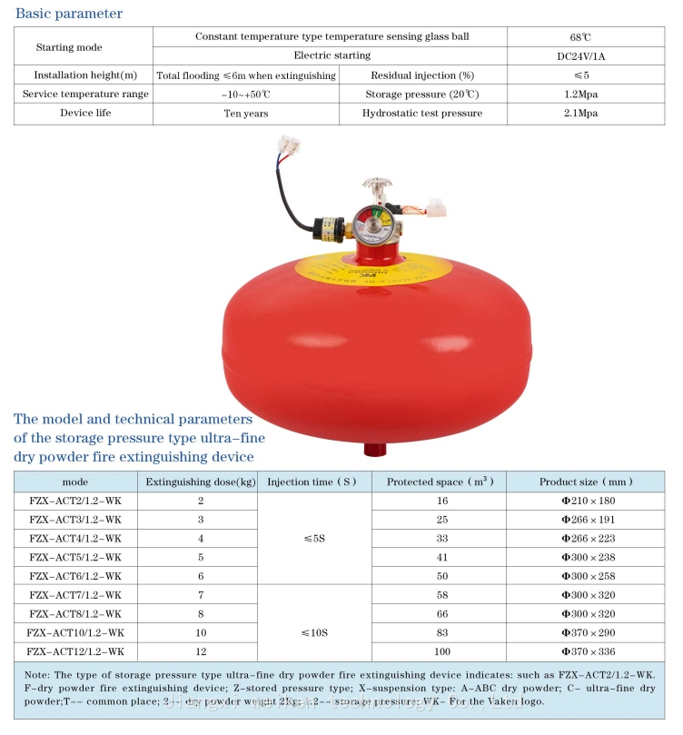 This fire suppression system consists of a fire extinguishing agent storage tank, ultra-fine dry powder fire extinguishing agent, omnidirectional nozzles, heat or electric initiation devices, mounting brackets, and other components.